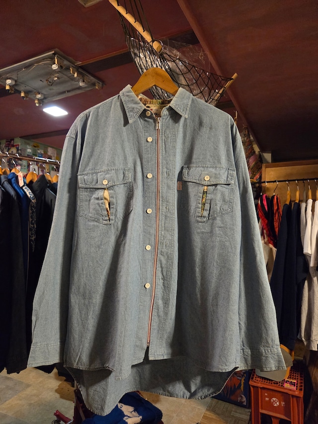 Re: Zip up Denim Shirts Cotton 100% 着丈71cm 身幅61cm 肩幅54cm 袖丈60cm サイズ表記メンズXL Re: シリーズ レギュラーの90sデニムシャツをジップアップ仕様にすることで、スウェットやニットとも相性よくジャケット的活用の出来るデザインに。