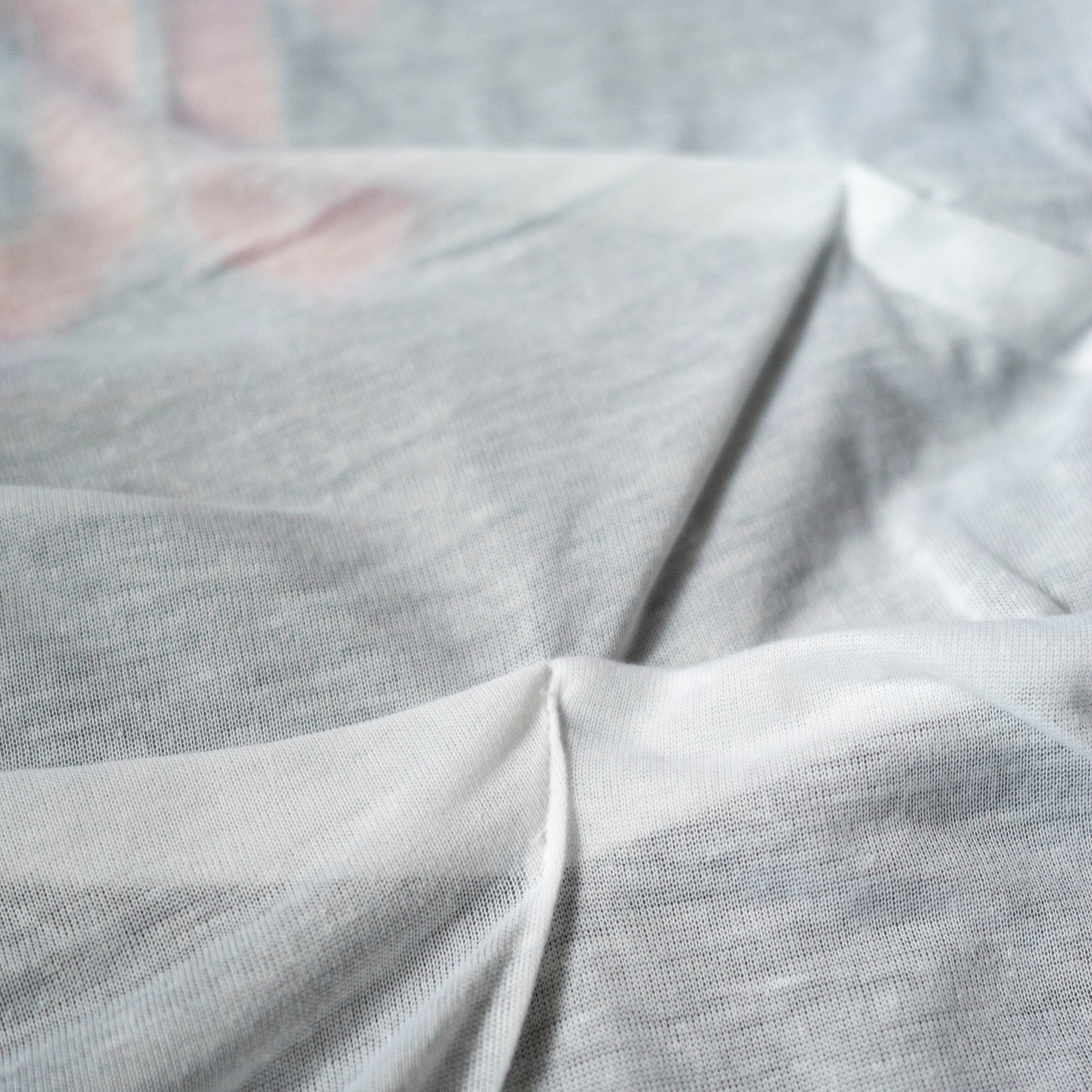 プリントTシャツの上から薄いTシャツを覆うことでTシャツが本来持っていた広告性を曖昧にしています。2着重ねて一緒に縫い止めることでTシャツ同士の共生性と不思議な造形が生まれました。織ネームの上からシルクスクリーンプリントしたタグを囲み縫いでボディの間に挟み込んでいます。