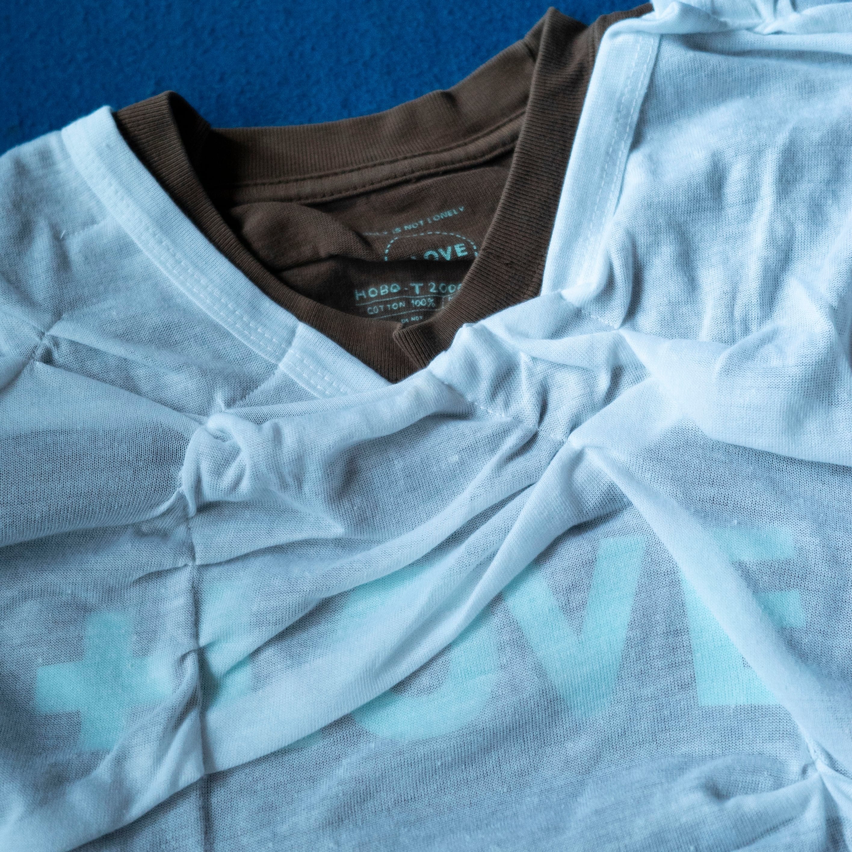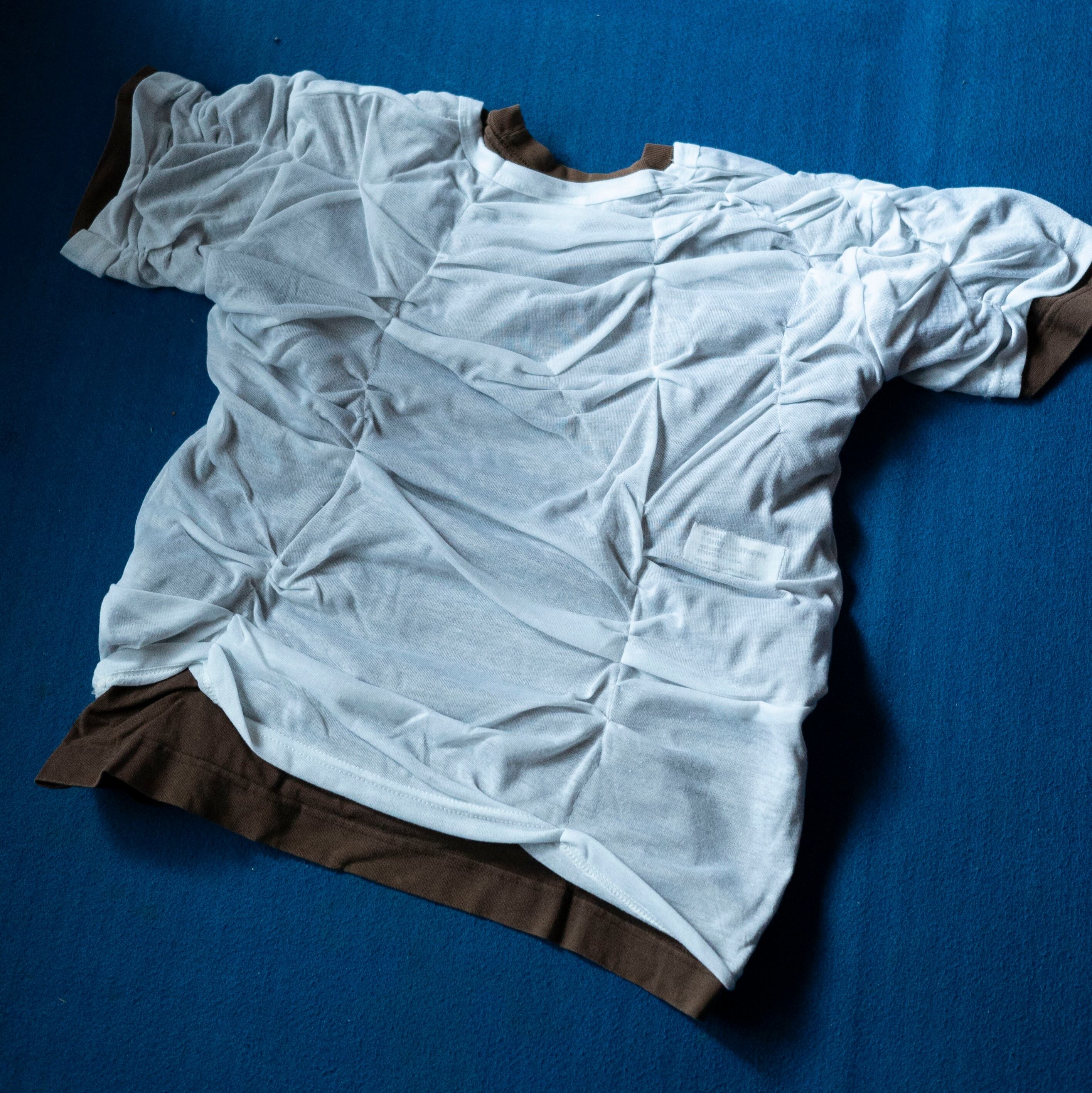 プリントTシャツの上から薄いTシャツを覆うことでTシャツが本来持っていた広告性を曖昧にしています。2着重ねて一緒に縫い止めることでTシャツ同士の共生性と不思議な造形が生まれました。織ネームの上からシルクスクリーンプリントしたタグを囲み縫いでボディの間に挟み込んでいます。