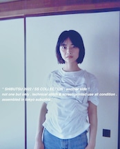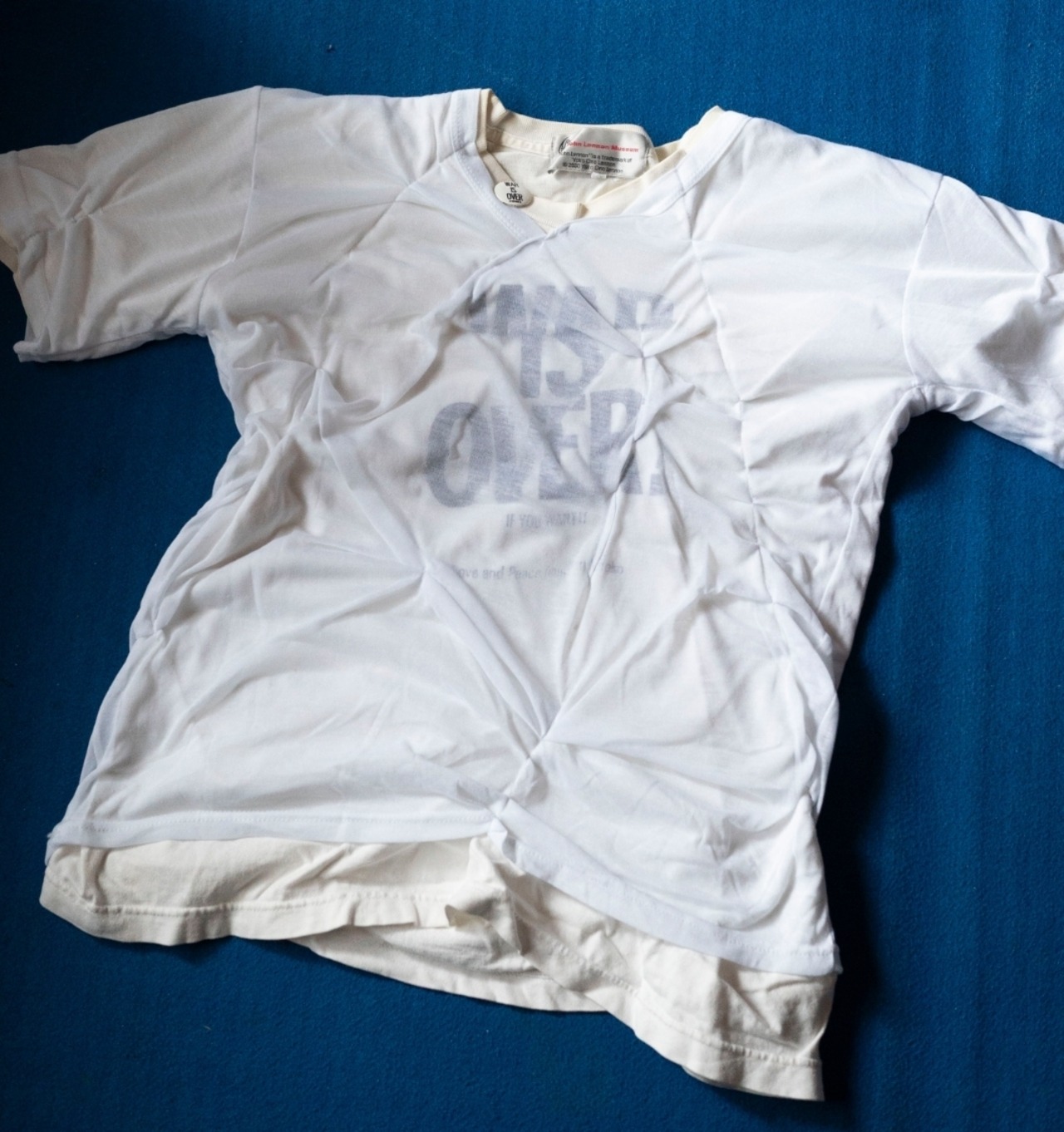 プリントTシャツの上から薄いTシャツを覆うことでTシャツが本来持っていた広告性を曖昧にしています。2着重ねて一緒に縫い止めることでTシャツ同士の共生性と不思議な造形が生まれました。織ネームの上からシルクスクリーンプリントしたタグを囲み縫いでボディの間に挟み込んでいます。