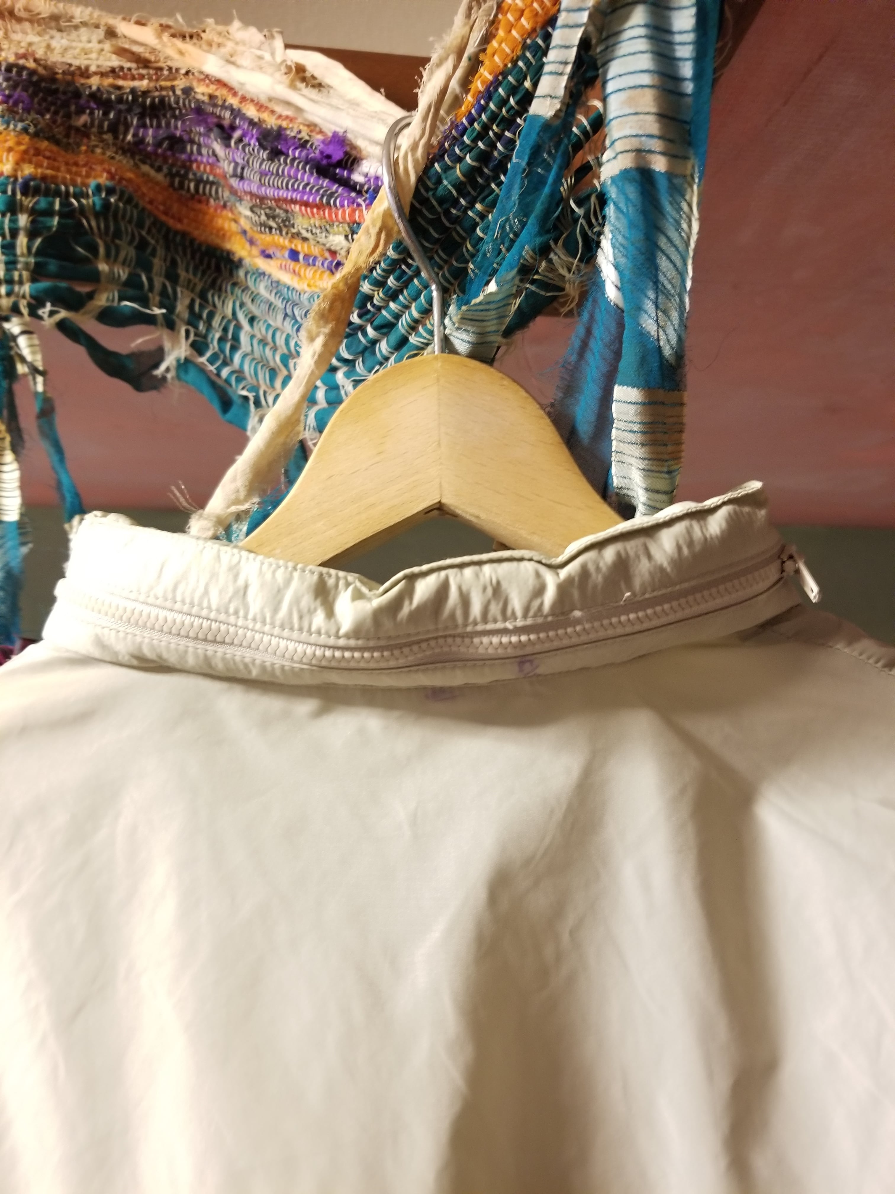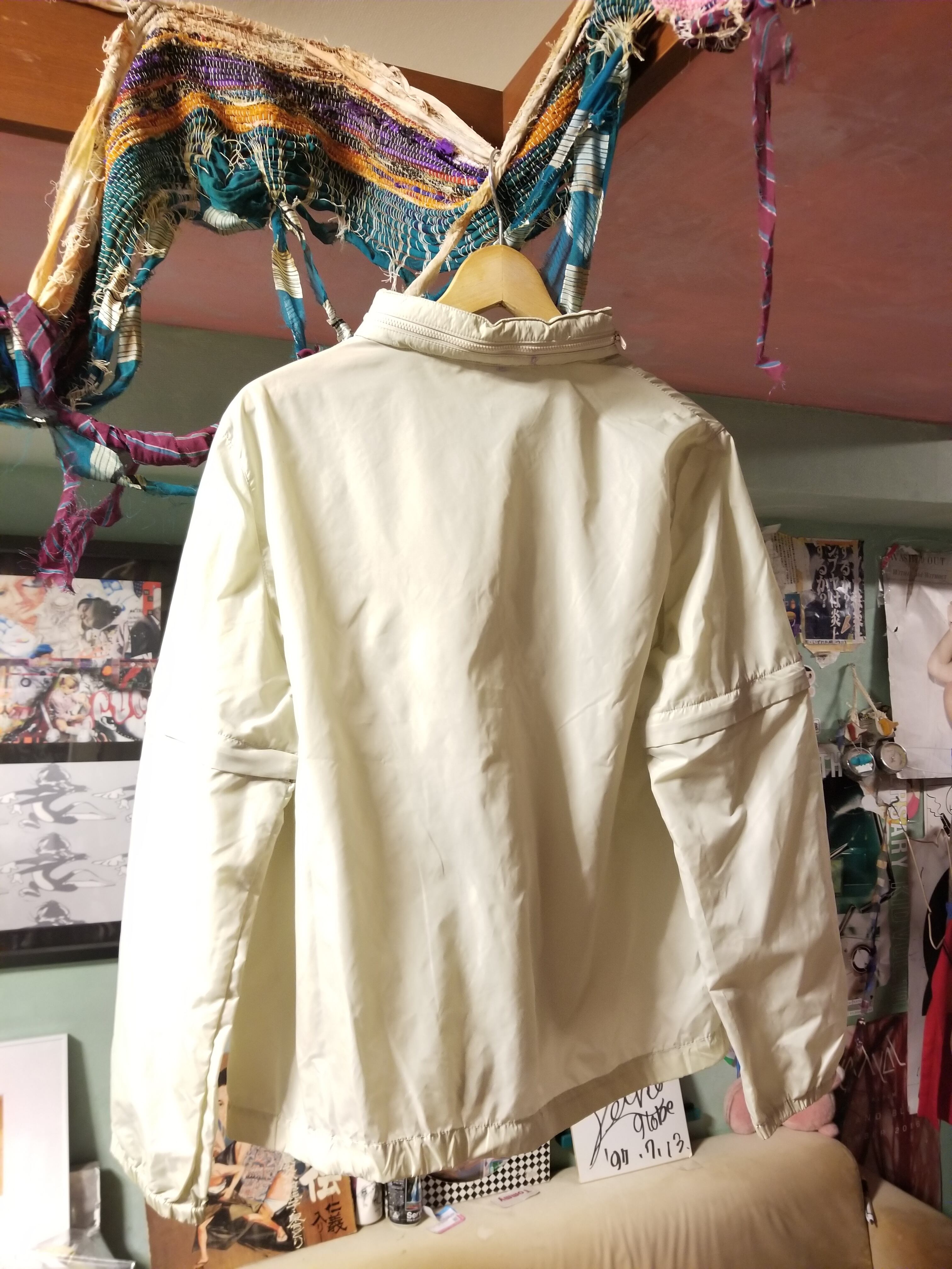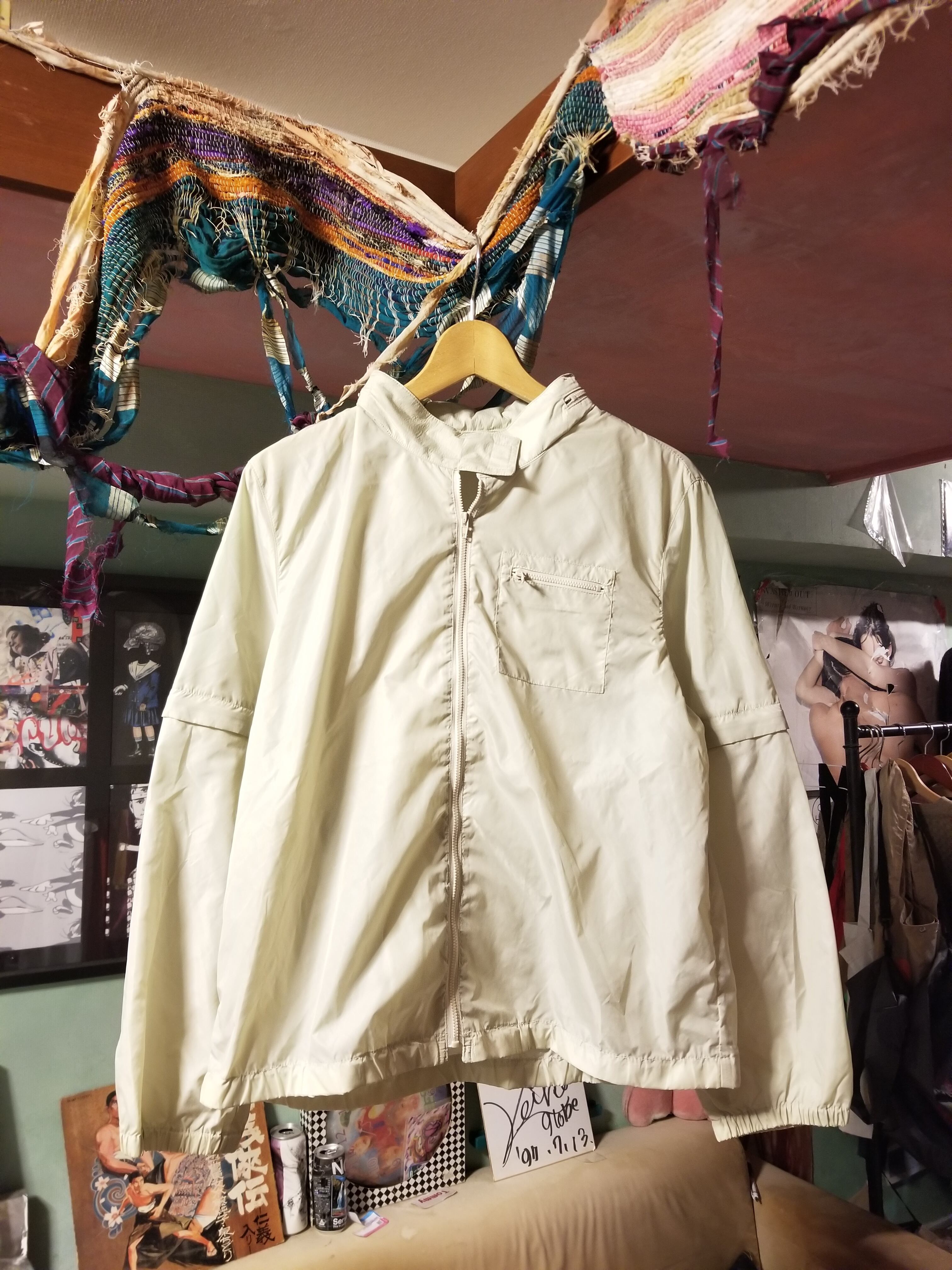 スリーヴが半袖になる2way仕様のジップ、スタンドカラーにフード収納付き。