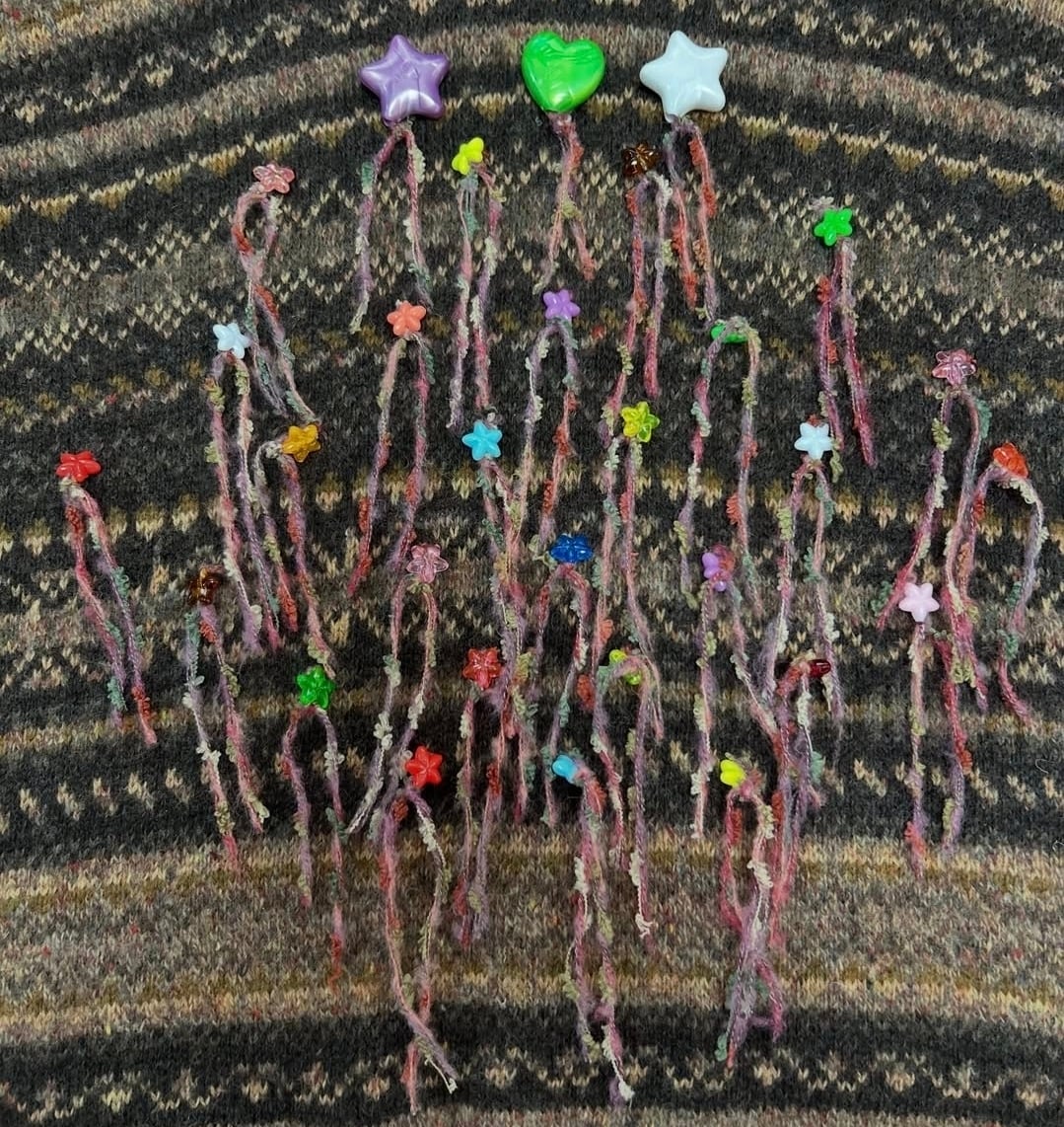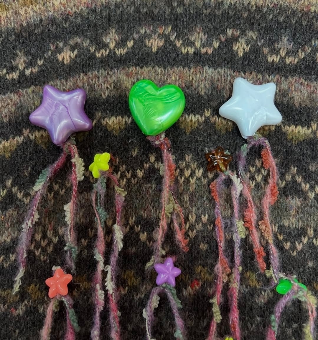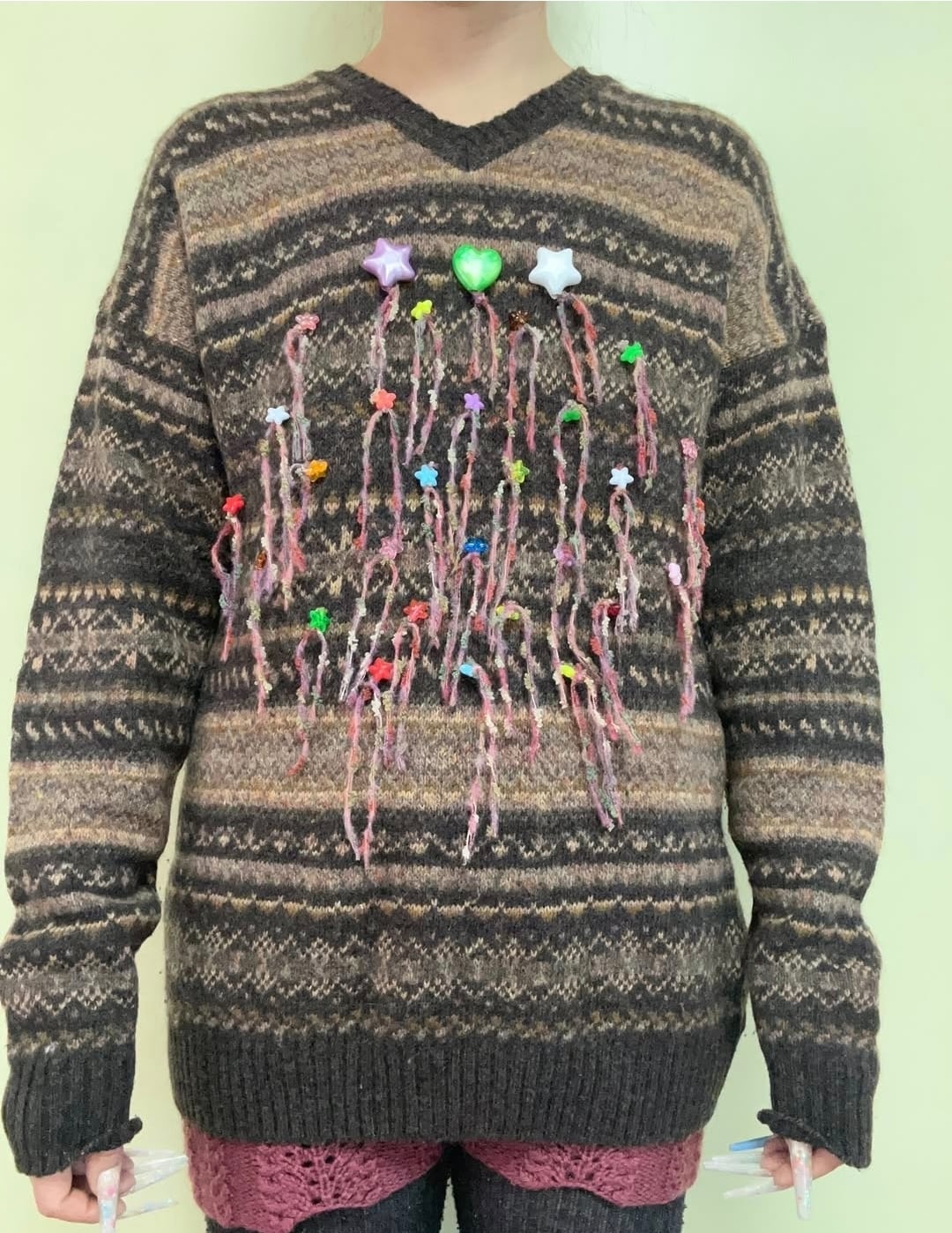 アクセサリーパーツを使用し、フロントにはファンシーでキュートなモチーフを散りばめています。