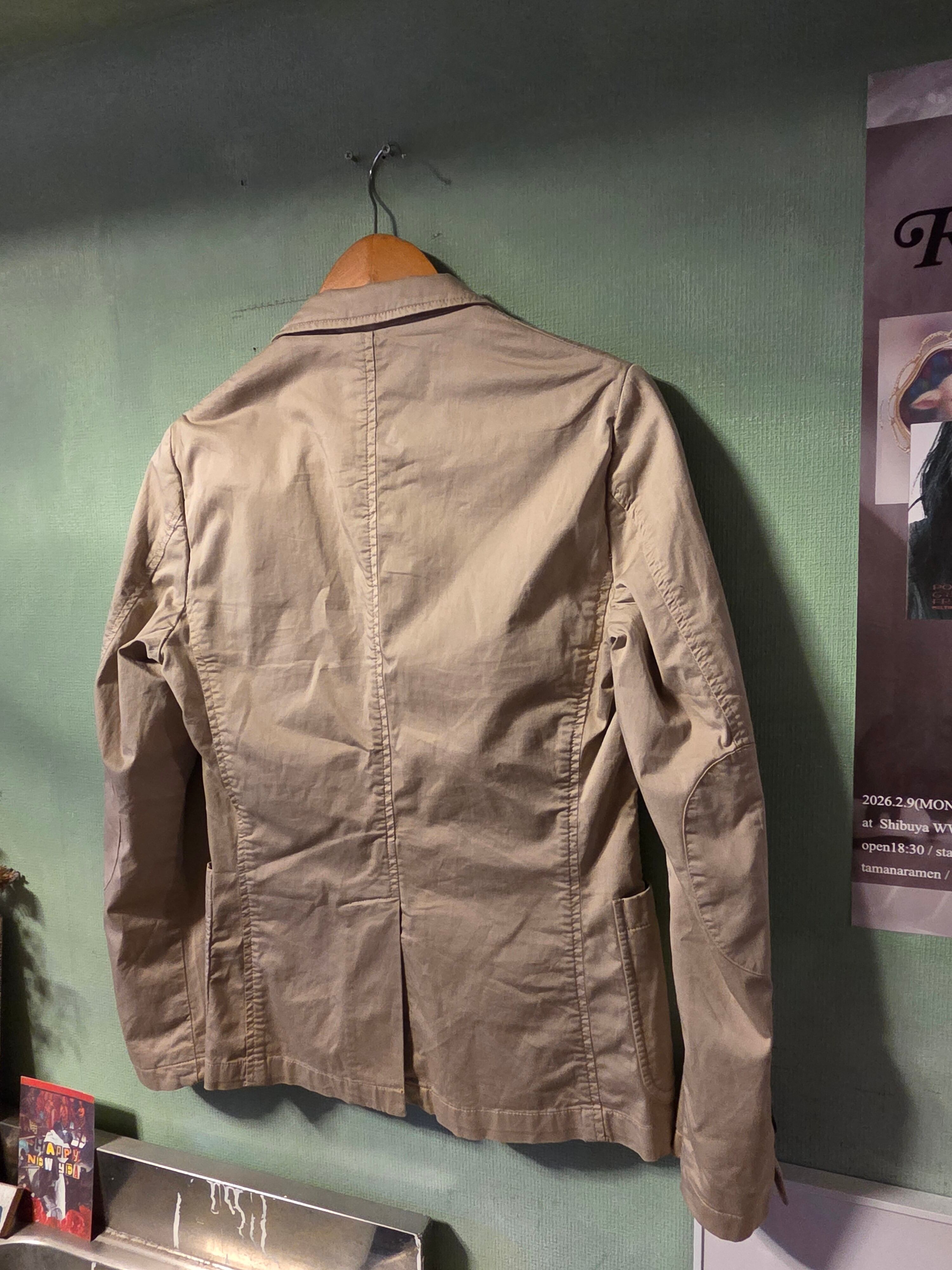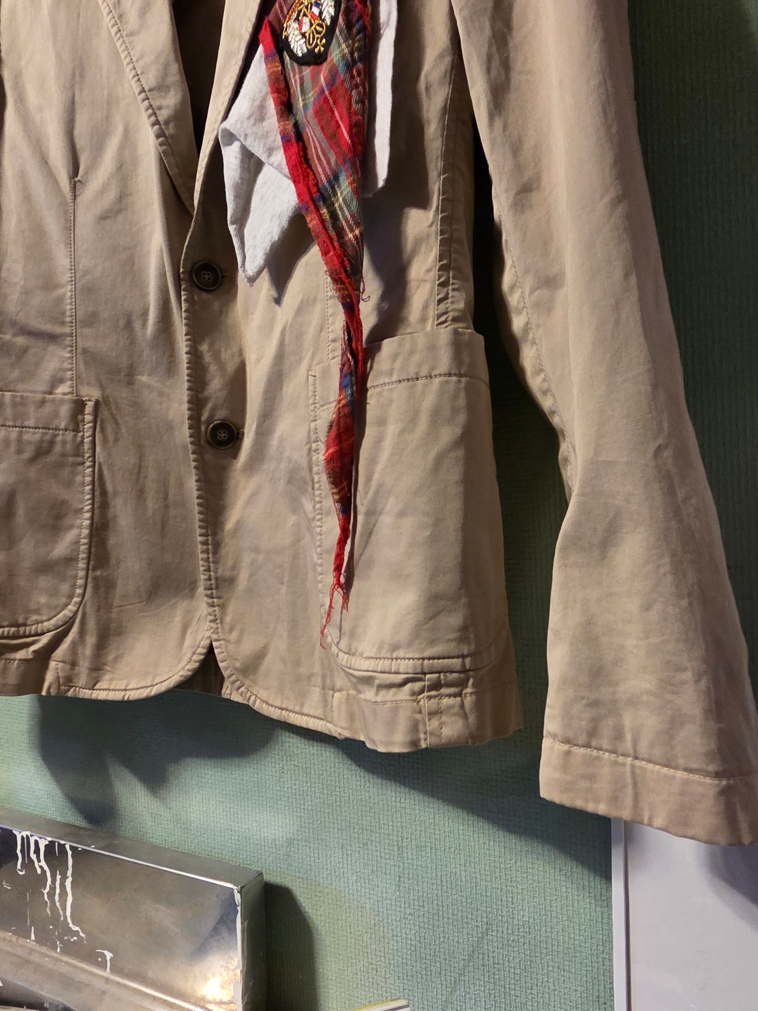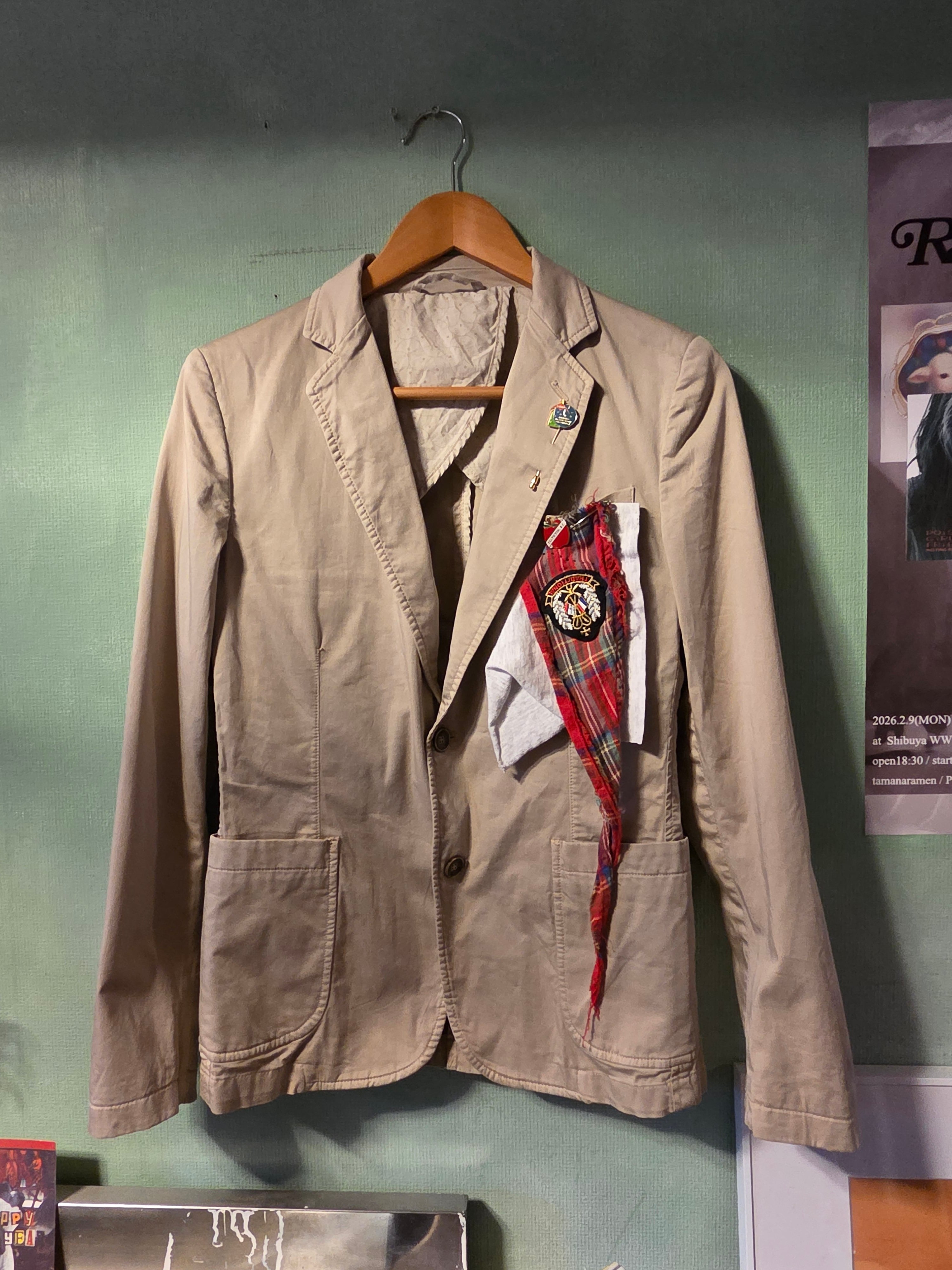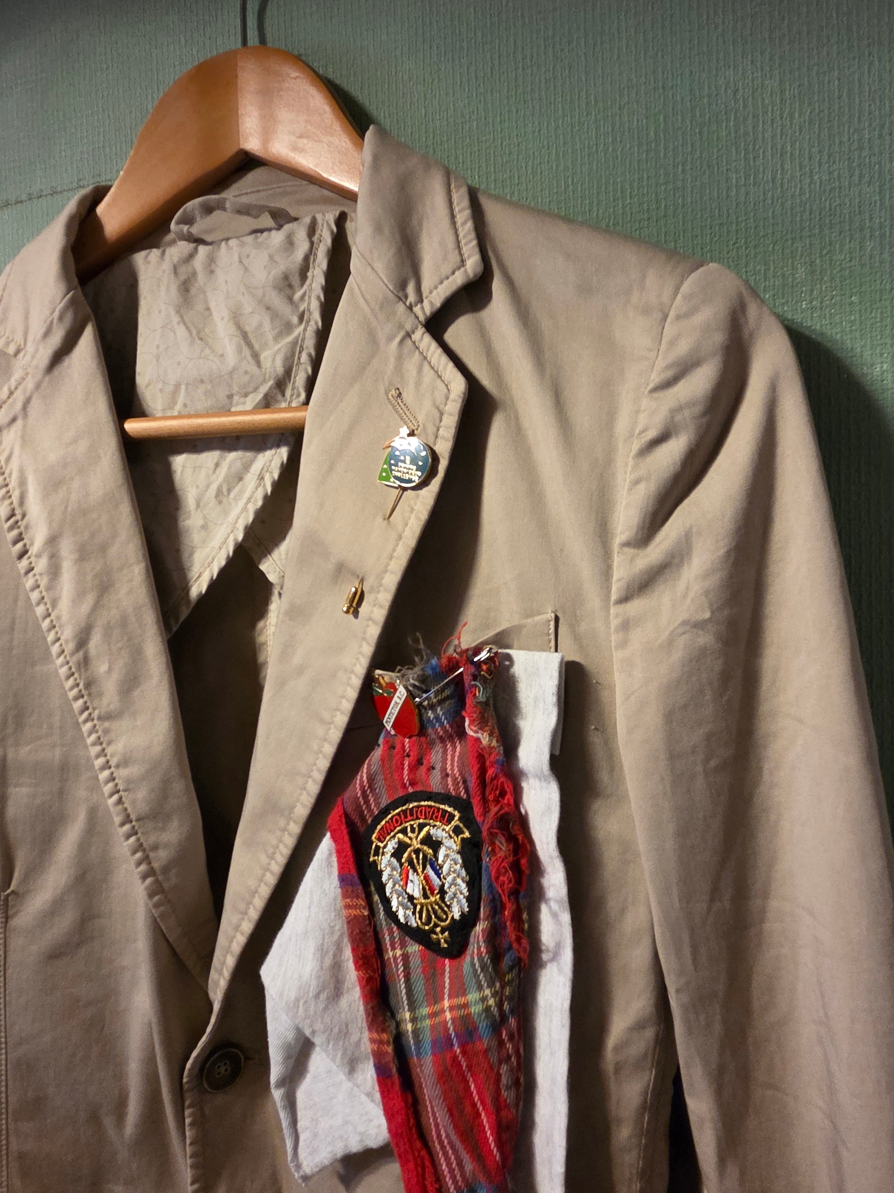 ピンズ2種と端切れが添えられたカジュアルスーツジャケット。