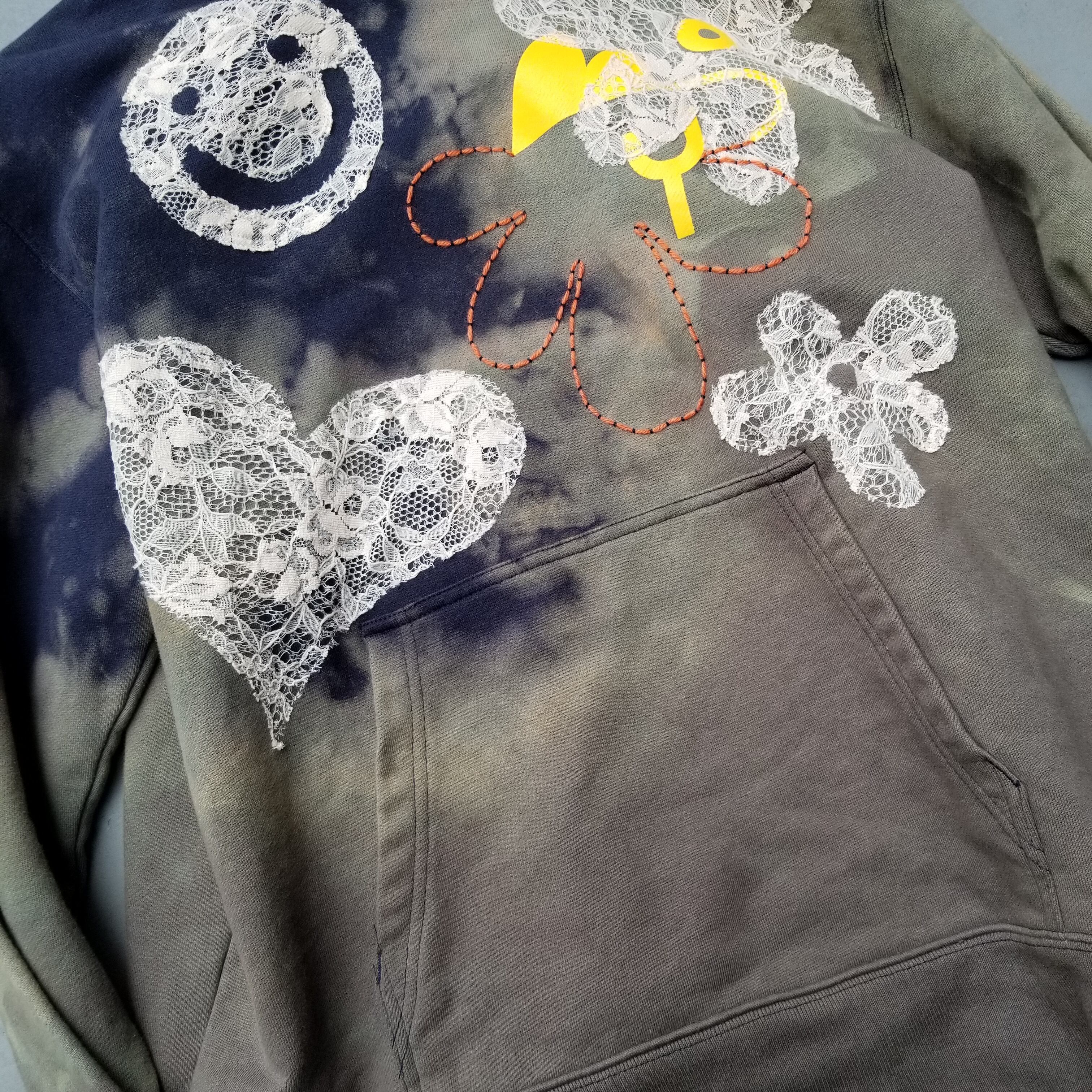 BOYロゴがプリントされていた左胸には毛糸の刺繍と、BOYがストックしていたレースの布地から、BEBI・奥冨ともに好きなハートやスマイルなどモチーフにカットして縫い付け。