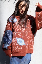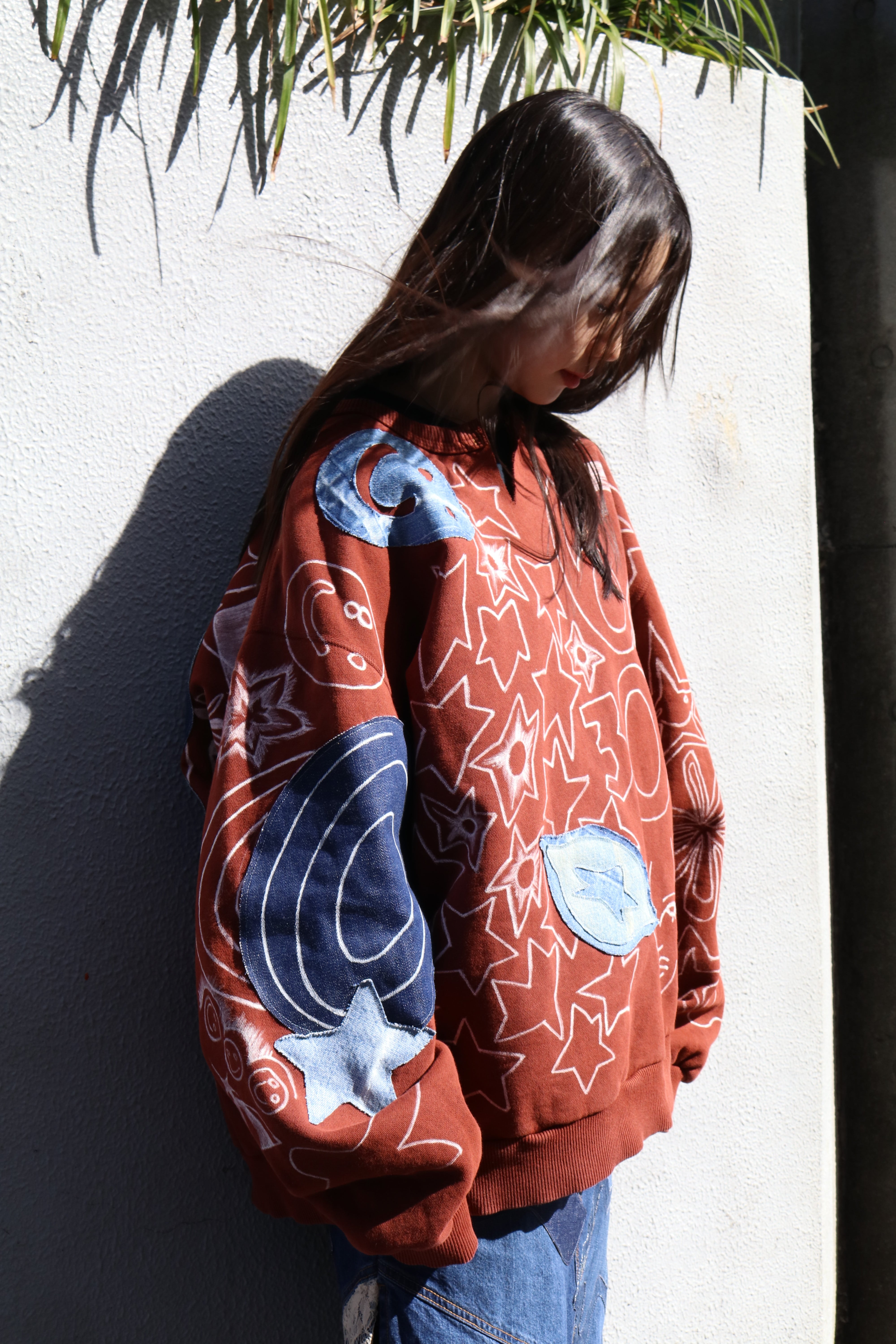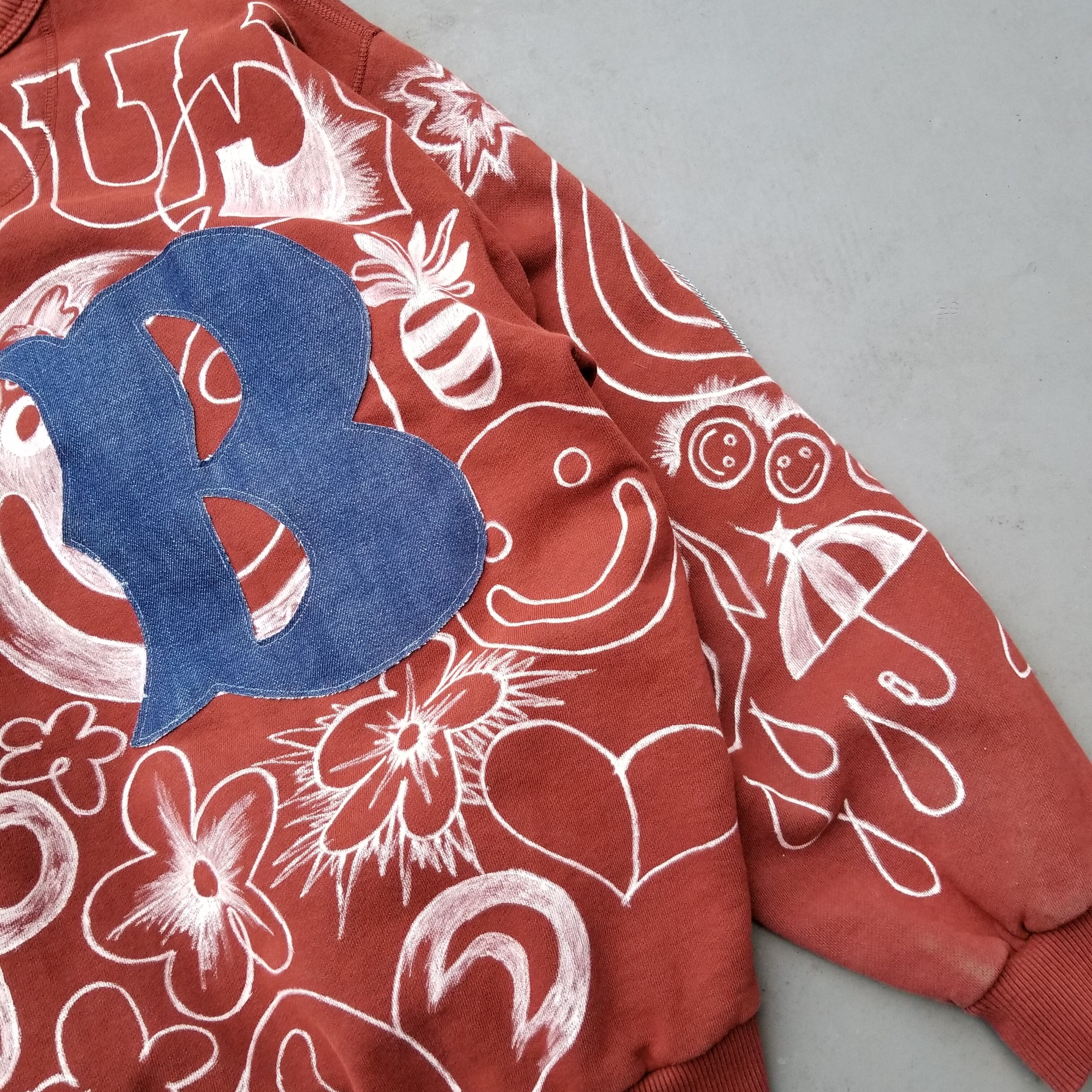 本制作のアイデア帳的な服。デザインやイメージを膨らませるために走り書きしたメモをそのまま直接ペイント。縫い付けたデニムのパッチは他のアイテムを制作する際に試作したもの