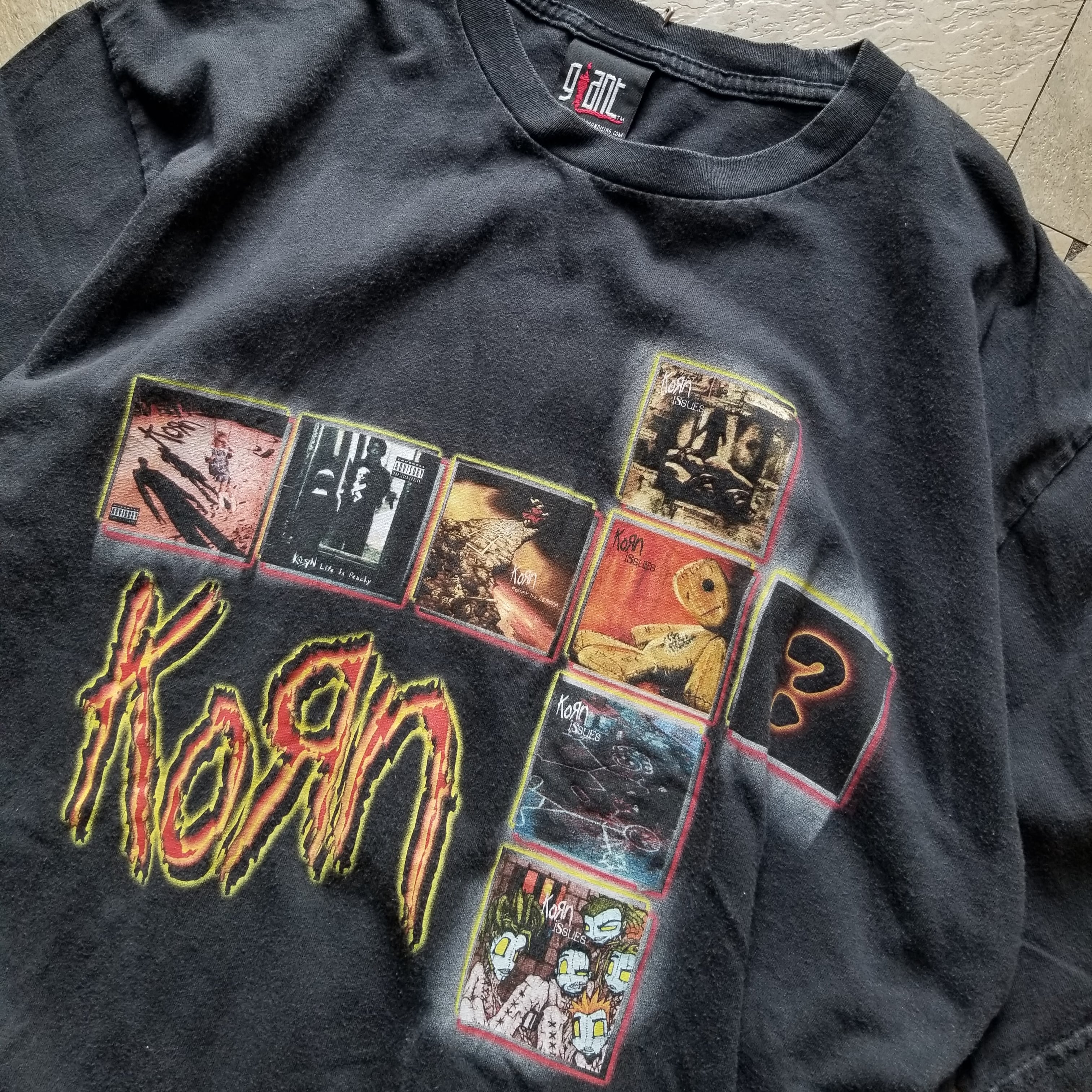 デビューAL"Korn"から歴代アルバムジャケが並べられたプリントは、giantボディーの着倒された雰囲気とも○